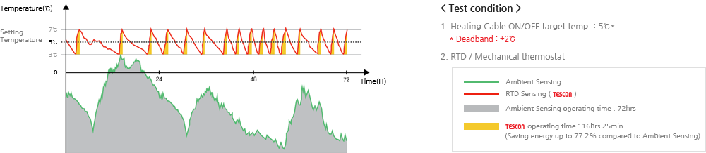 TESCON System을 적용하였을 경우 대기온도와 관계없이 배관온도를 직접 측정, 제어하며 목표온도(5°C)에 맞춰 설정온도(±2°C)에